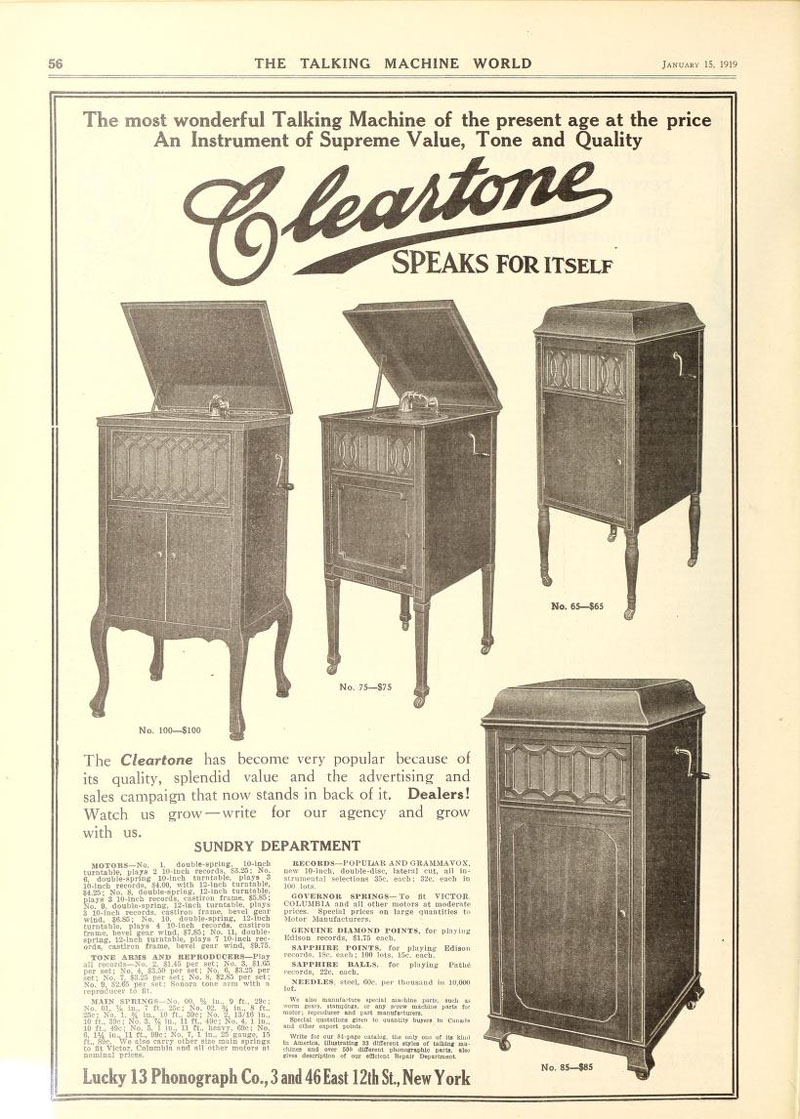 The Cleartone - Lucky 13 Phonograph Co., The Talking Machine World, January 1919