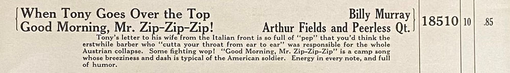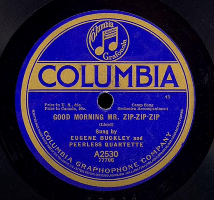 For a Good Morning Mr. Zip-Zip-Zip YouTube video created in 2014 by abendstunde49 using the Columbia Grafonola Record A2530 sung by Eugene Buckley and Peerless Quartette LISTEN HERE.