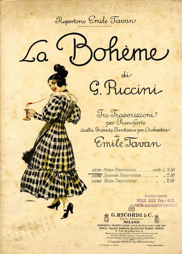 1895 advertisement for the music score of Giacomo Puccini's La bohème, showing the quartette in the third act between Marcello, Musetta, Mimi, and Roldolpho - Wikipedia (20)
