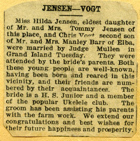 Chris "Crissie" Vogt, who was born on November 4, 1907 at Elba, Nebraska to Frank and Anna Ellen Ender Vogt.