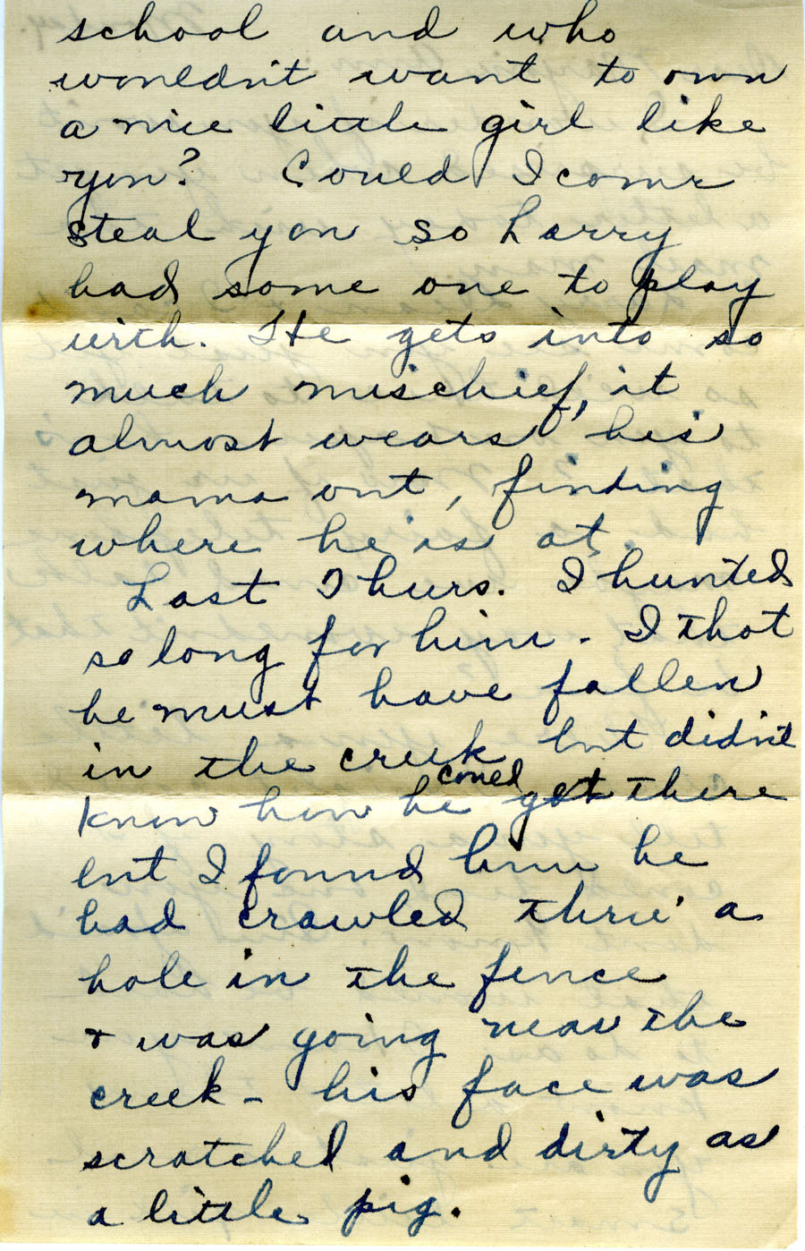 Last Thurs. I hunted so long for him. I thought he must have fallen in the creek but didn't know how he could get there but I found him he had crawled thru' a hole in the fence & was going near the creek. -- his face was scratched and dirty as a little pig.