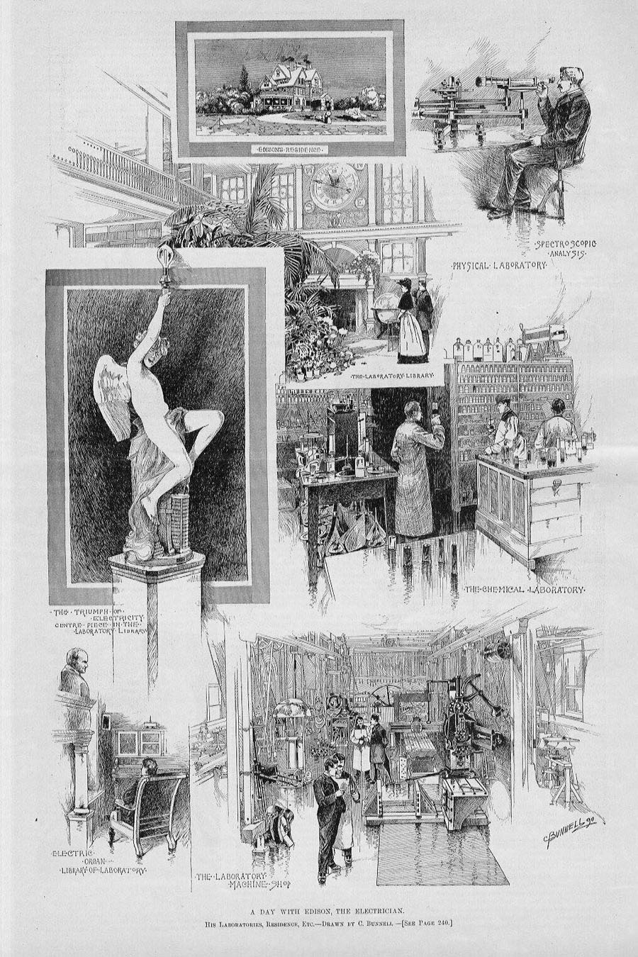 "A Day with the Edison, the Electrician. His Laboratory, Residence, etc. -- Drawn by C. Bunnell."