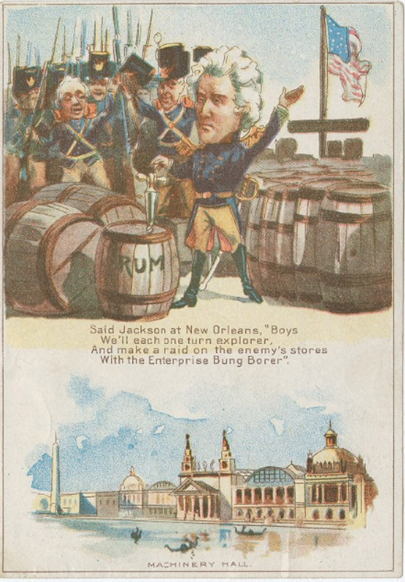 Trade card for Enterprise Bung Borer, Donaldson Brothers Litho, NY ©1893. (Courtesy The Library Company of Philadelphia) - Andrew Jackson using the Enterprise Bung Borer with WCE's Machinery Hall also featured.