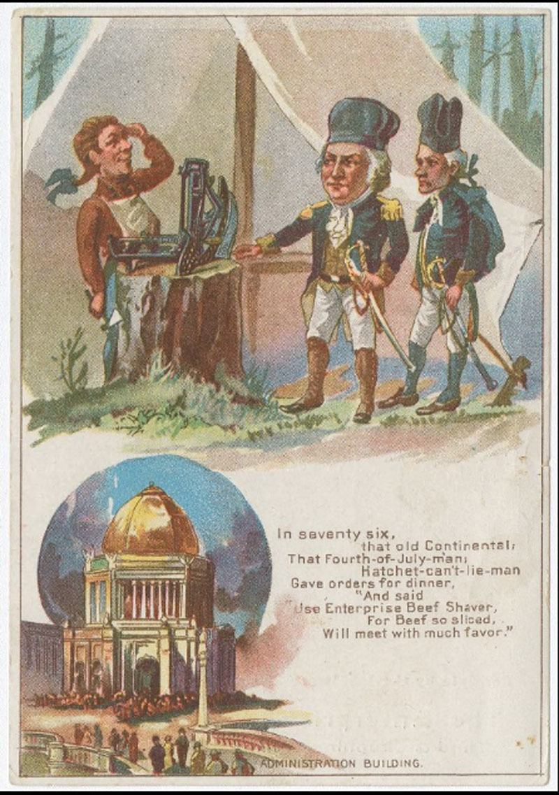Trade card for Enterprise Beef Shaver. Donaldson Brothers Litho, NY ©1893. (Courtesy The Library Company of Philadelphia) - In 1773 "they spilled the tea then drank their fill of coffee ground in Enterprise Mill." The Administration Building at the WCE is also featured.