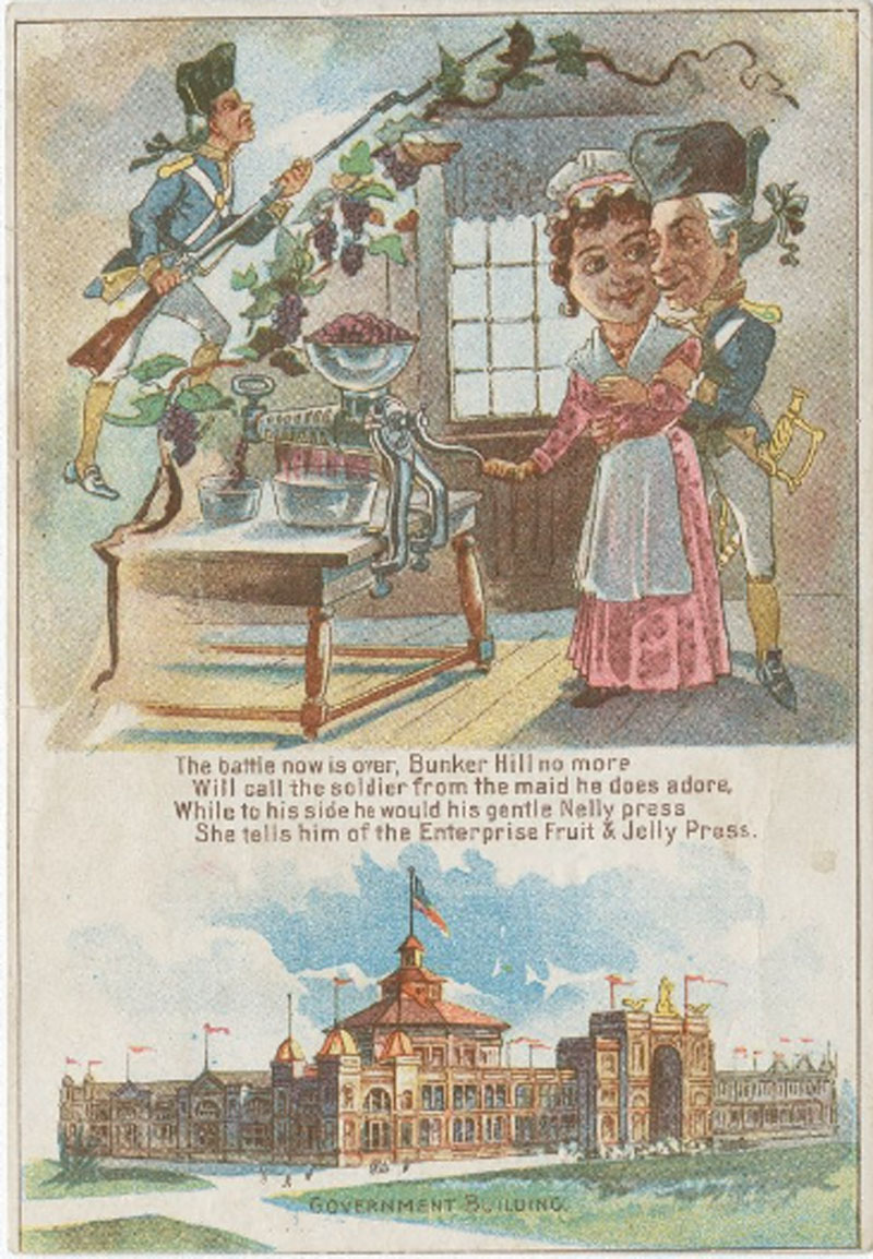 Trade card for Enterprise Fruit and Jelly Press, Donaldson Brothers Litho, NY ©1893. (Courtesy The Library Company of Philadelphia) - Bunker Hill no more...Nelly tells her soldier friend of the Enterprise Fruit & Jelly Press with WCE's Government Building also featured.