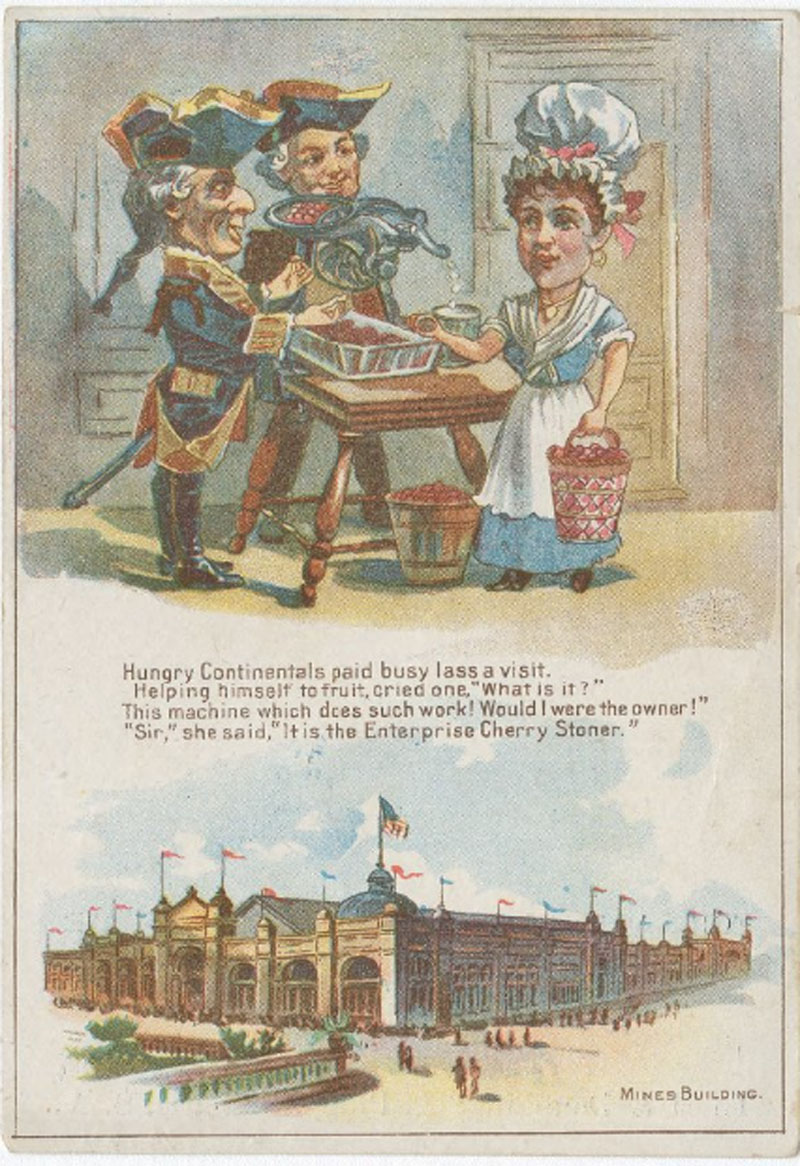 Trade card for Enterprise Cherry Stoner, Donaldson Brothers Litho, NY ©1893. (Courtesy The Library Company of Philadelphia) - "It is the Enterprise Cherry Stoner" with WCE's Mines Building also featured.