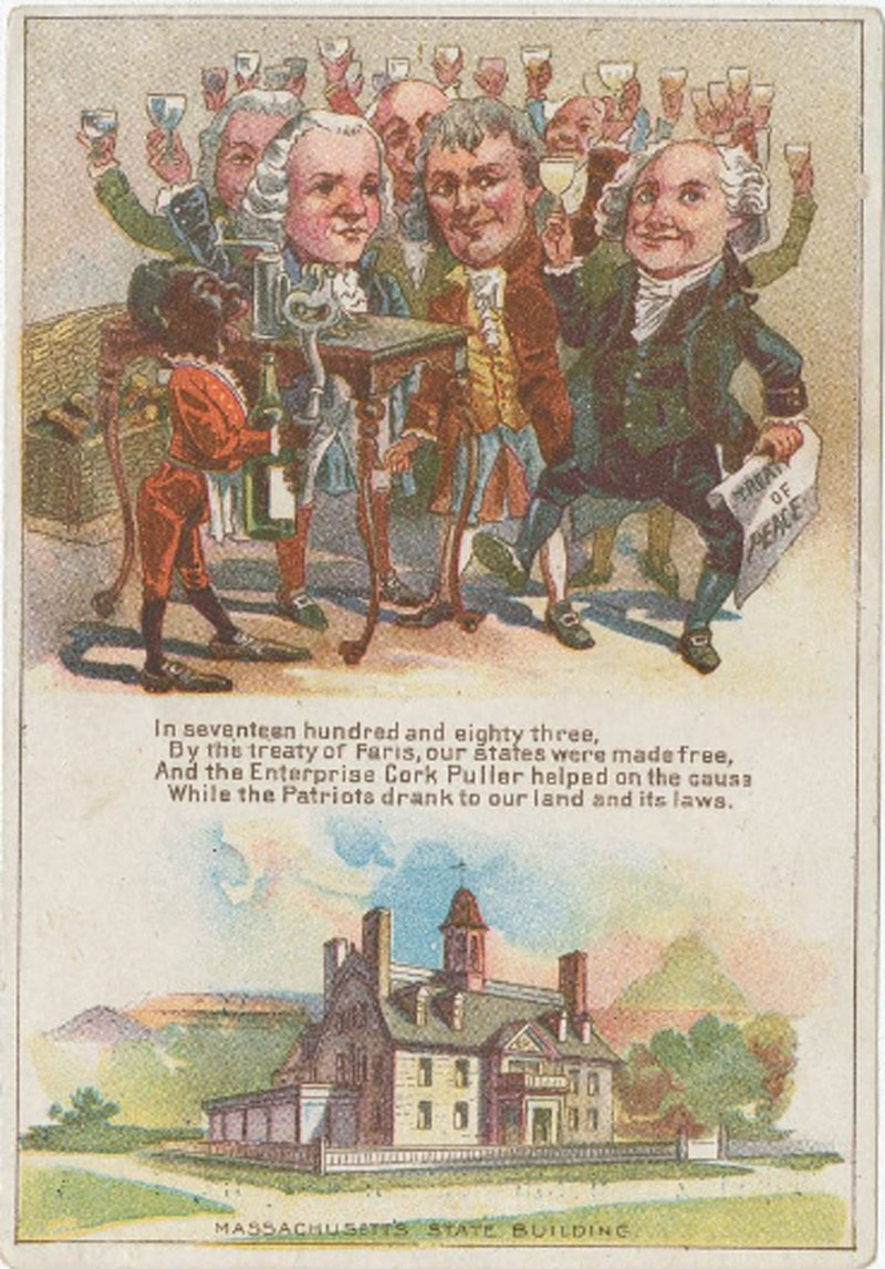 Trade card for Enterprise Cork Puller, Donaldson Brothers Litho, NY ©1893. (Courtesy The Library Company of Philadelphia) - By the Treaty of Paris, our States were made free with help from the Enterprise Cork Puller with WCE's Massachusett's State Building also featured.