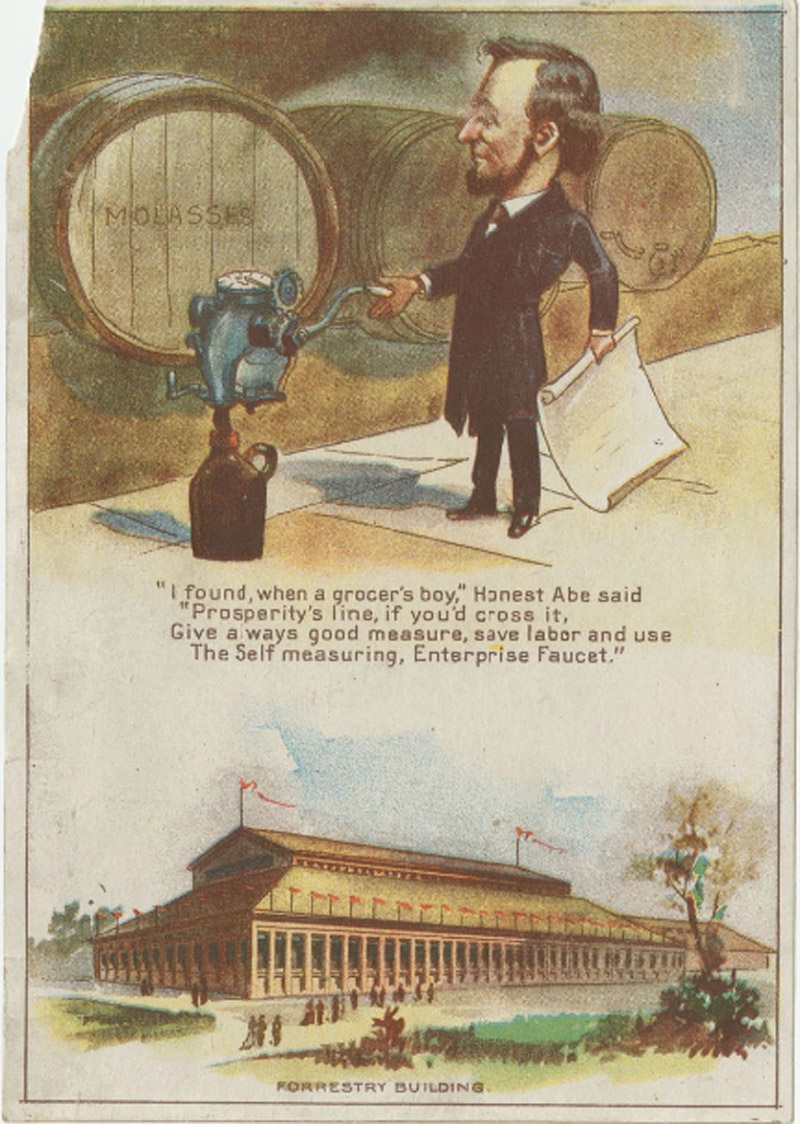 Honest Abe using the Self measuring, Enterprise Faucet. The WCE's Forerestry Building is also featured.