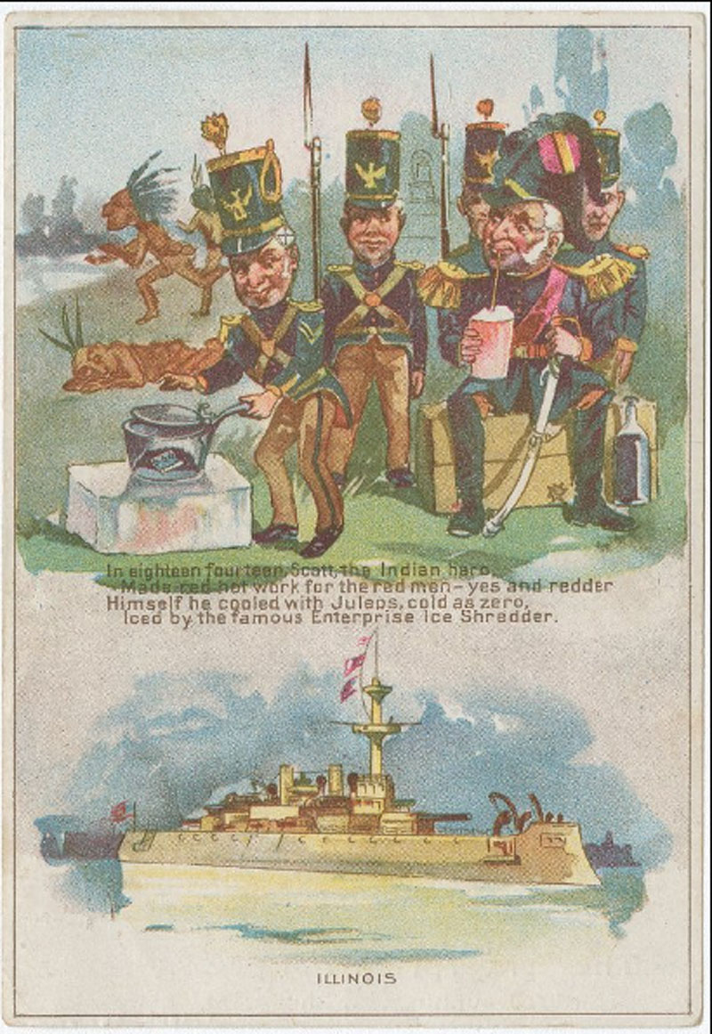 Trade card for Enterprise Ice Shredder. Donaldson Brothers Litho, NY ©1893. (Courtesy The Library Company of Philadelphia) - "In 1814 Scott, the Indian hero, cooled Juleps using the famous Enterprise Ice Shredder." The Illinois, a full-scale mockup of an Indiana-class coastal defense battleship, constructed as a naval exhibit at the WCE is also featured.
