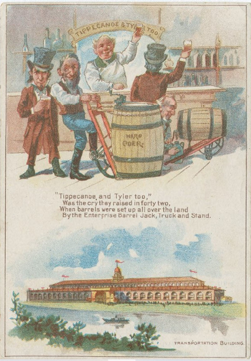 Trade card for Enterprise Barrel Jack, Truck and Stand. Donaldson Brothers Litho, NY ©1893. (Courtesy The Library Company of Philadelphia) - "Barrels are set up over the land By the Enterprise Barrel Jack, Truck and Stand." WCE's Transportation Building is also featured.