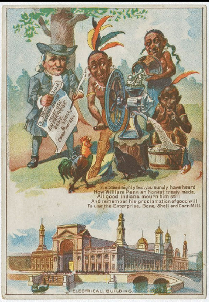 Trade card for Enterprise Bone, Shell, and Corn Mill. Donaldson Brothers Litho, NY ©1893. (Courtesy The Library Company of Philadelphia) - "In 1682 William Penn made a treaty that Indians use the Enterprise Bone, Shell and Corn Mill. The Electrical Building at the WCE is also featured.