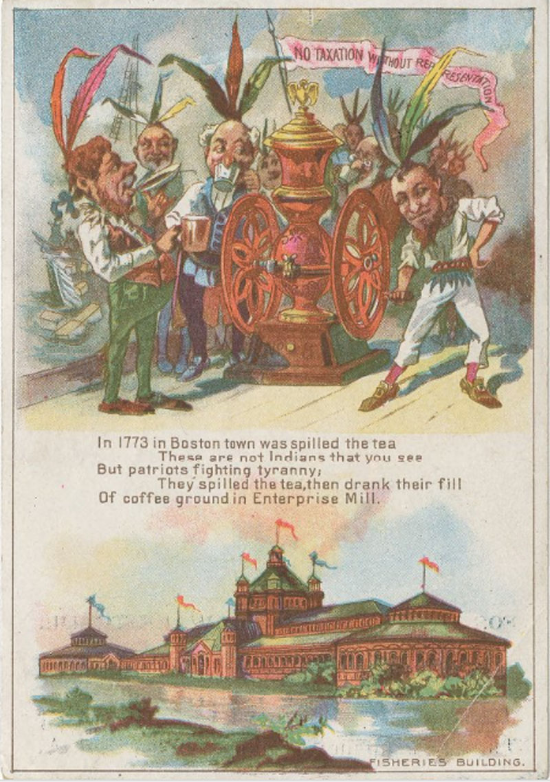 Trade card for Enterprise Coffee Mill. Donaldson Brothers Litho, NY ©1893. (Courtesy The Library Company of Philadelphia) - In 1773 "they spilled the tea then drank their fill of coffee ground in Enterprise Mill." The Fisheries Building at the WCE is also featured.