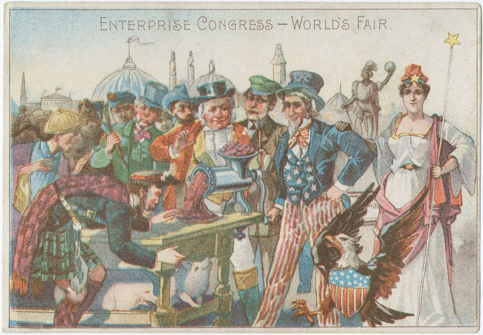 Trade card for Enterprise Sausage Stuffer. Donaldson Brothers Litho, NY ©1893. (Courtesy The Library Company of Philadelphia) - Said Peter Stuyyesant Life would have been rougher without the Enterprise Sausage Stuffer. The WCE Fisheries Building is also featured.