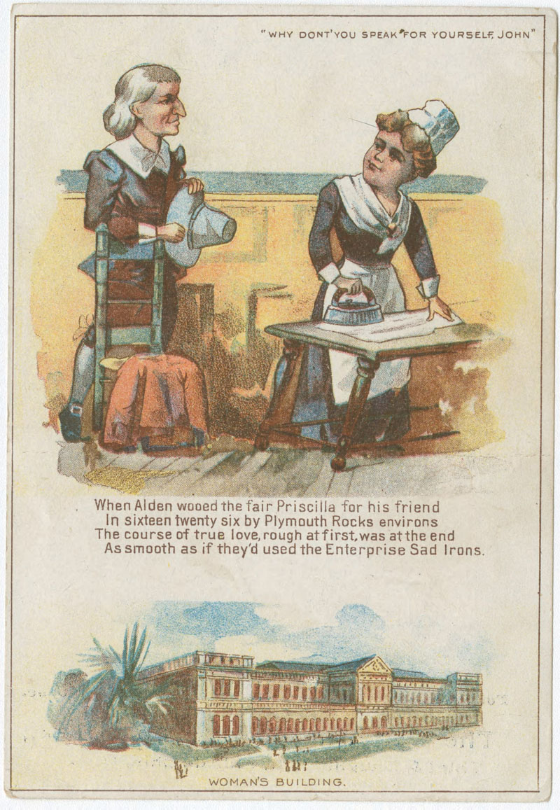 Trade card issued during the Columbian Exposition of 1893 advertising Enterprise Mf'g Co. of Pa. "cold handle sad irons." Contains an anachronistic historical scene captioned "Why Don't You Speak For Yourself John" including the notable Pilgrim couple Priscilla and John Alden. Scene shows John Alden beside a chair on which a jacket rests and behind Priscilla, attired in 19th-century like Pilgrim's attire, ironing a shirt on a table with an Enterprise sad iron. Also contains a view of the Italian Renaissance-style Woman's Building designed by Sophie Hayden. The exposition held in Chicago May 1-October 30, 1898 celebrated the 400th anniversary of Christopher Columbus's arrival in the New World in 1492. Enterprise Manufacturing Co. of Pa. was established in 1866.
