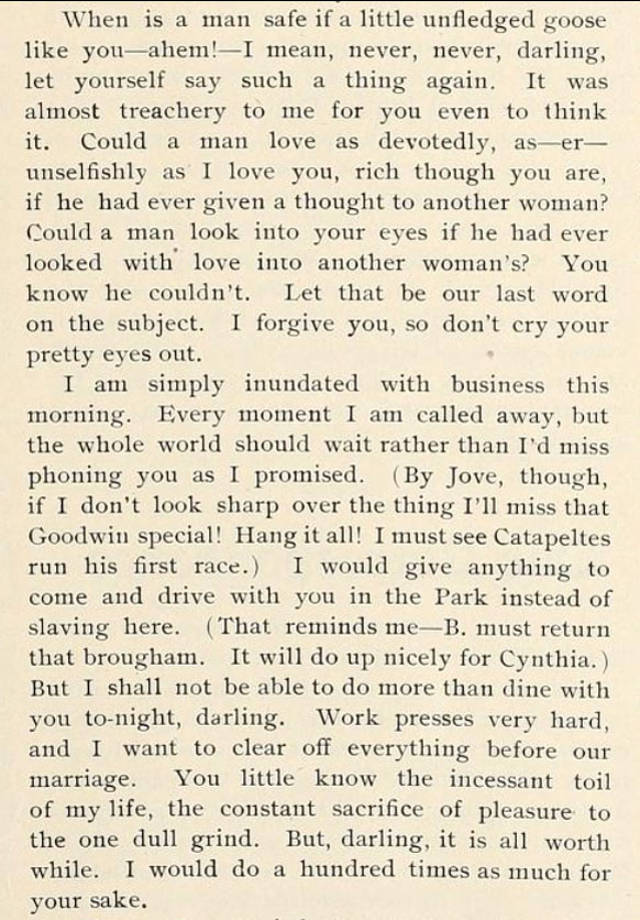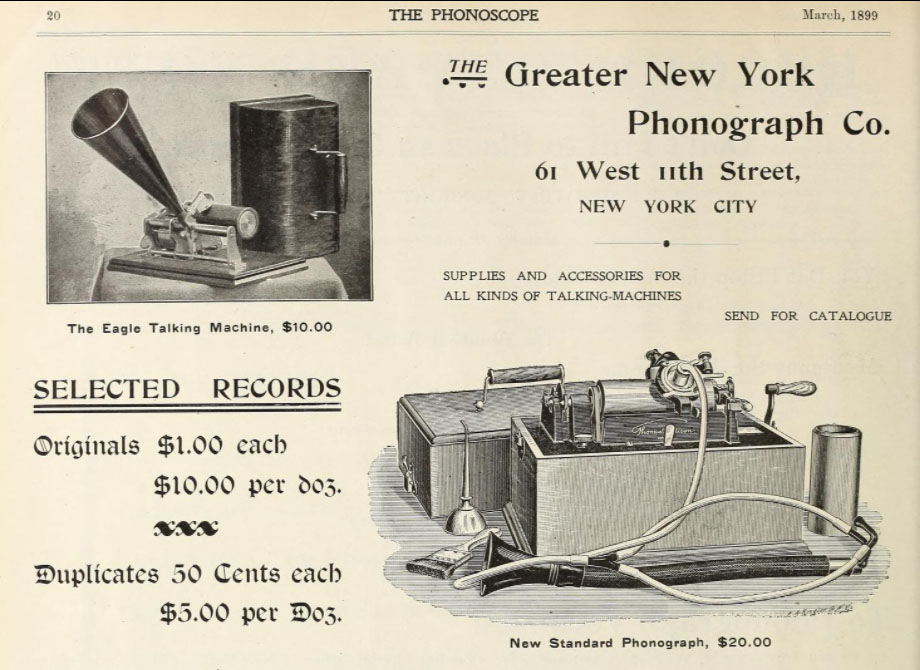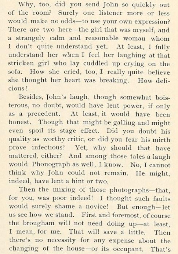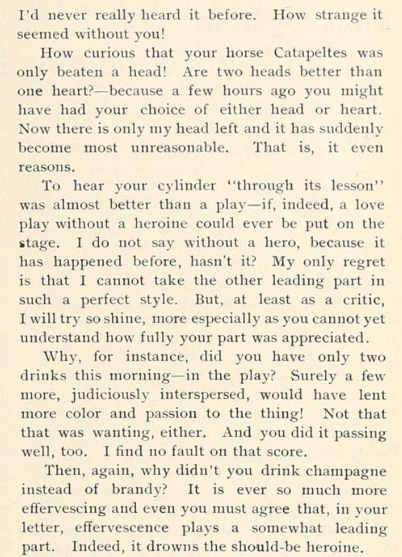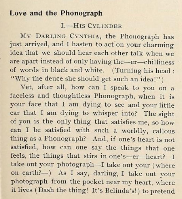 This story appeared in the monthly phonograph trade magazine The Phonoscope in March 1899. Because Cynthia had the "charming idea" to use the Phonograph for talking with each other when she and her fiancé, Claud, were apart Cynthia learns the truth about Claud. And her conclusion is of course a strong endorsement for owning a Phonograph when she says: "The Phonograph has been decidely a success. Nothing on the debit side at all."
