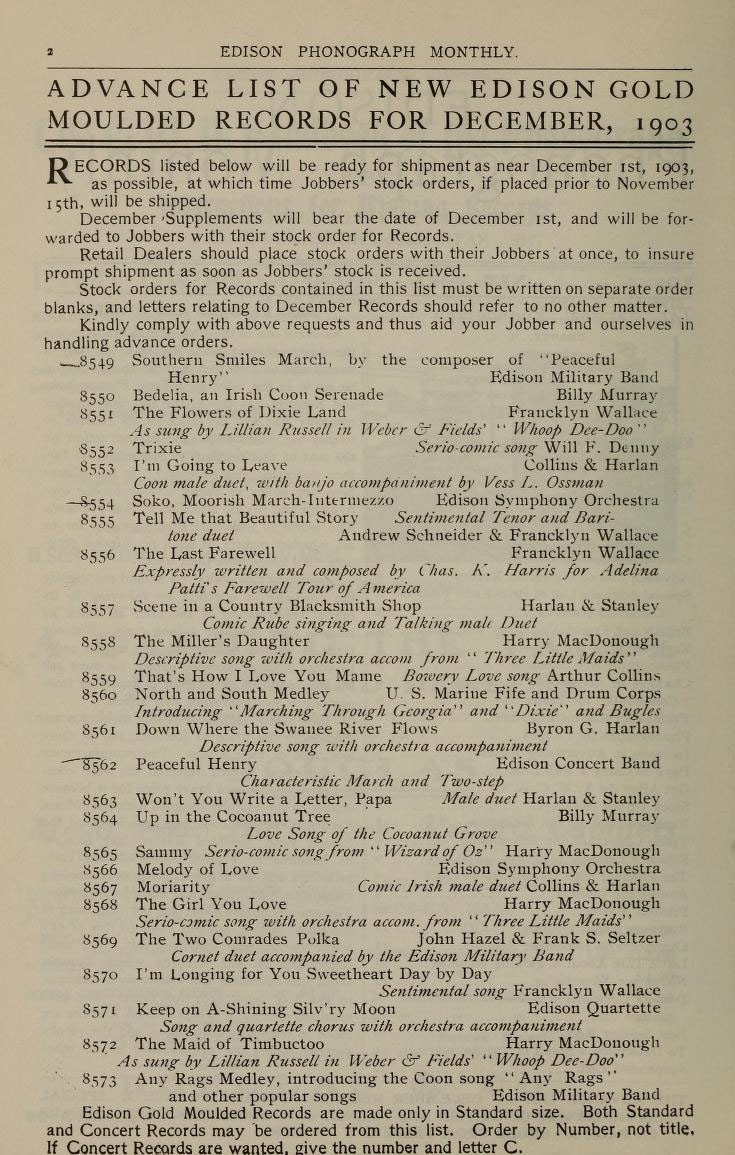 The Edison Phonograph Monthly, December 1903 which includes Record No. 8562 Peaceful Henry