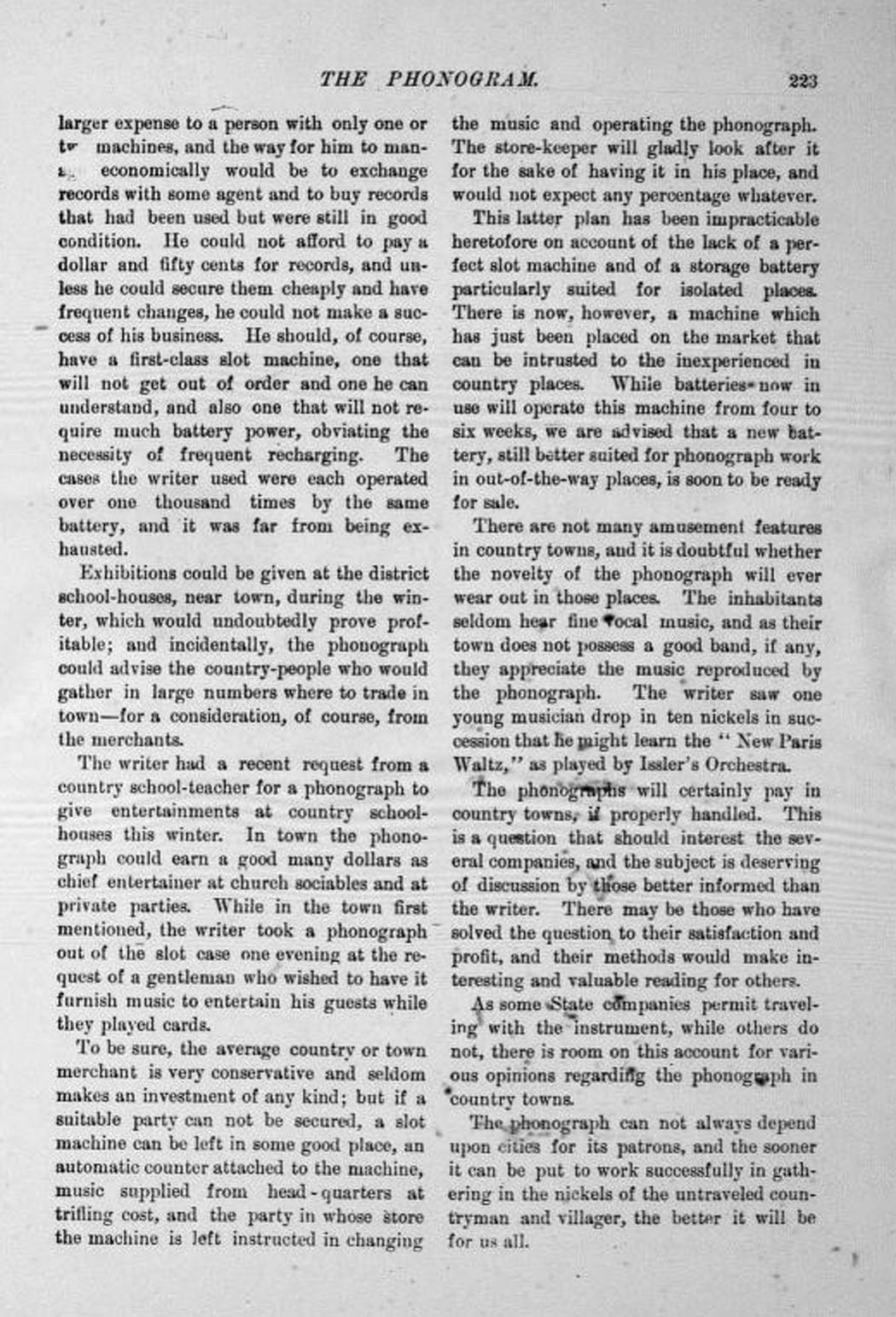 The following was written for the trade magazine The Phonogram by a "local agent" concluding that the Phonograph's coin-in-the-slot business could be profitable in country towns and villages of one thousand or more and that "the sooner that it can be put to work" the better "for us all."