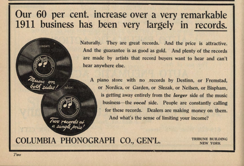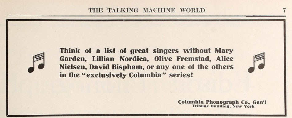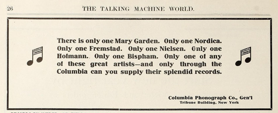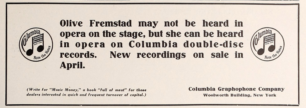 Columbia Records featuring Mary Garden and Olive Fremstad, 1916. Hearst’s, June 1916
