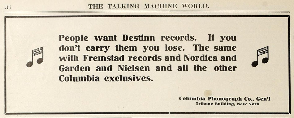 Announcement in the February 1911 trade magazine The Talking Machine World that Columbia has just added Nordica and Fremstad to their list of exclusive Columbia artists.