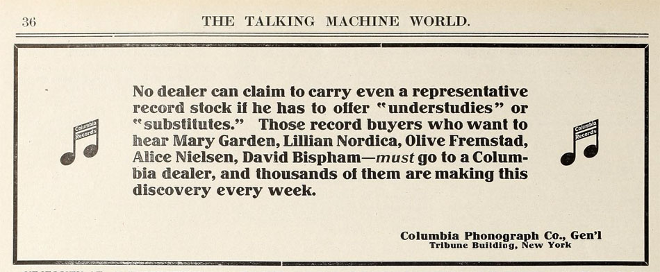 A piano store with no Fremstad, Nordica, or Garden records is missing out on the vocal side of the music business. 1912? NIC