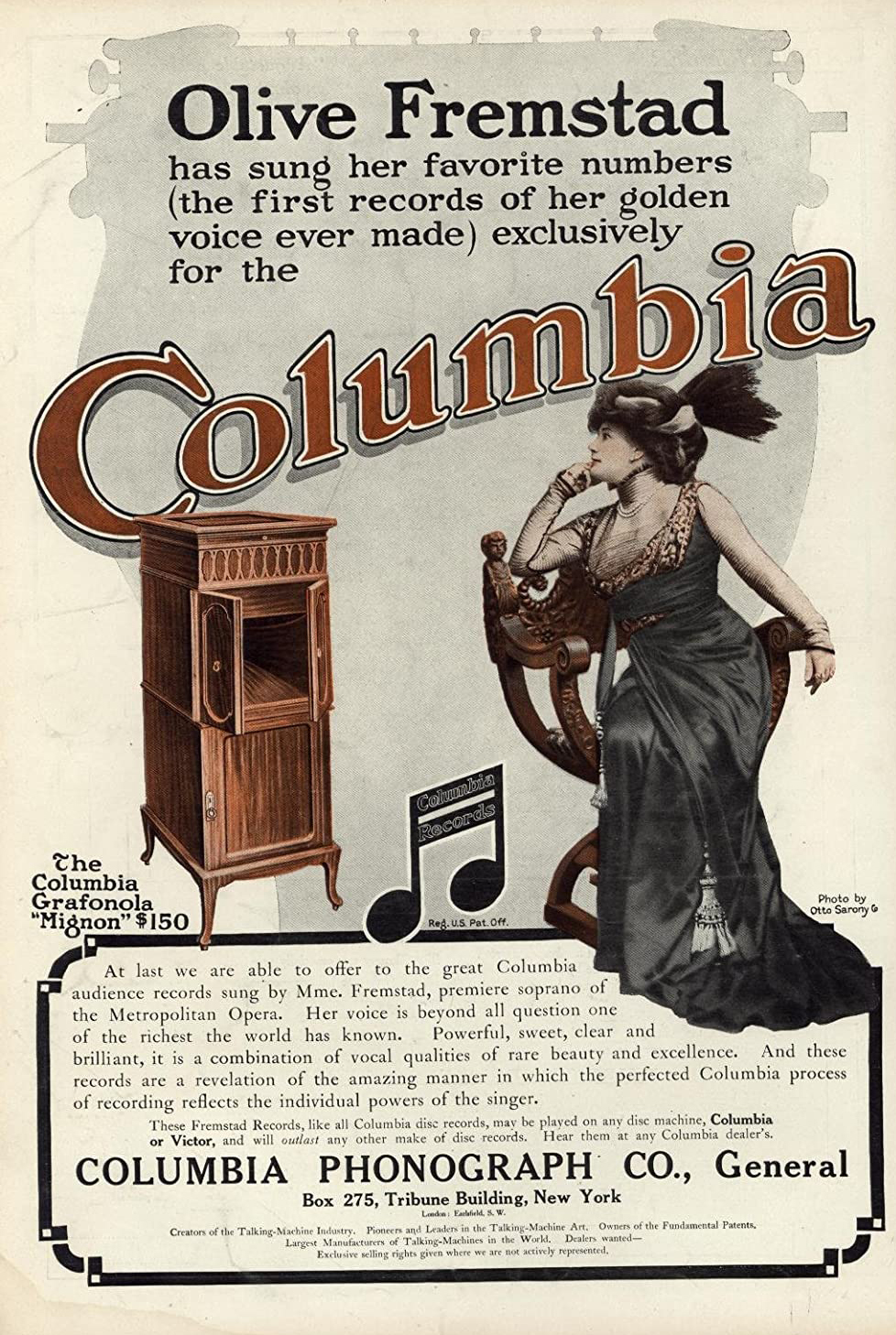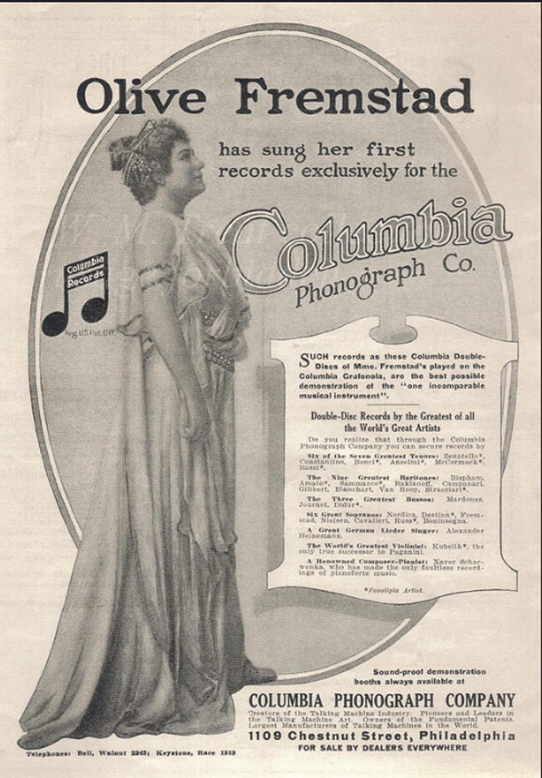 Besides starring on the opera stage Fremstad made phonograph records and was featured in advertisements which added her celebrity status, artistic reputation, and the prestige of opera to the promotion of the early phonograph.