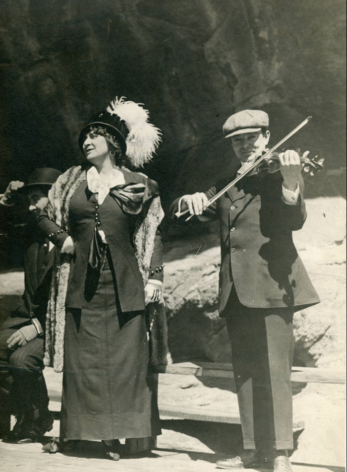 "Mary Garden singing wiith Signor Tibaldi, violinist, in the natural amphitheatre of Red Rocks, Morrison Park, near Denver, May 11, 1911. Said Garden: " Never in any opera house the world over have I found more perfect acoustic properties."