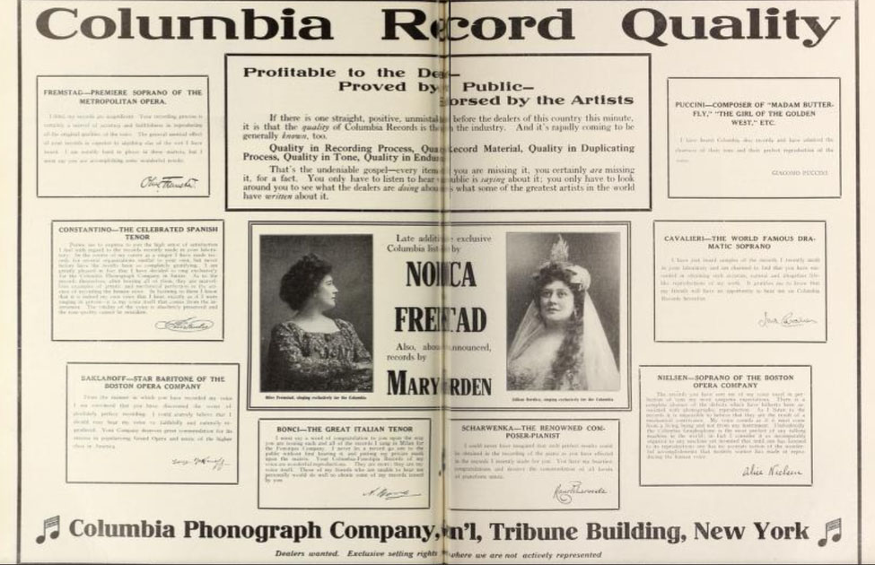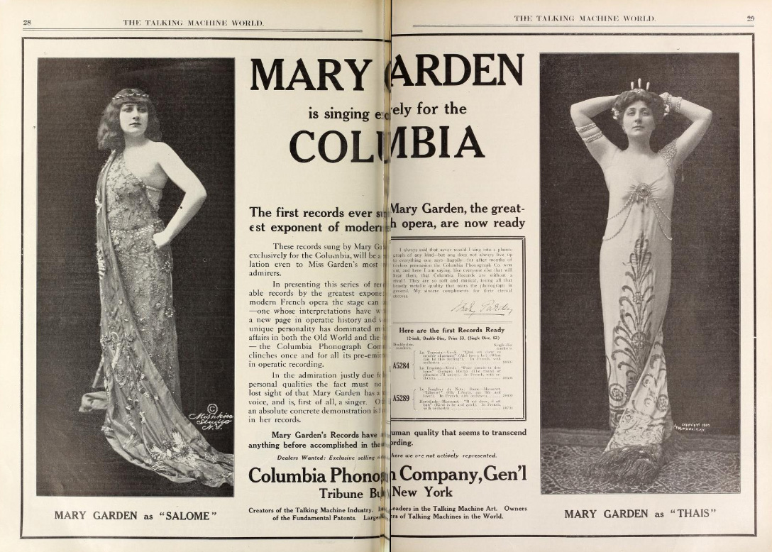 Besides starring on the opera stage Mary Garden made phonograph records and was featured in advertisements which added her celebrity status, artistic reputation, and the prestige of opera to the promotion of the early phonograph.