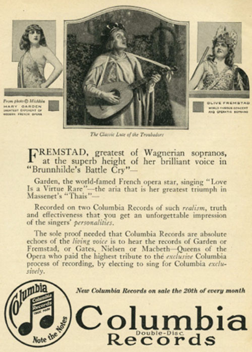 Columbia Records featuring Mary Garden and Olive Fremstad, 1916. Hearst’s, June 1916.