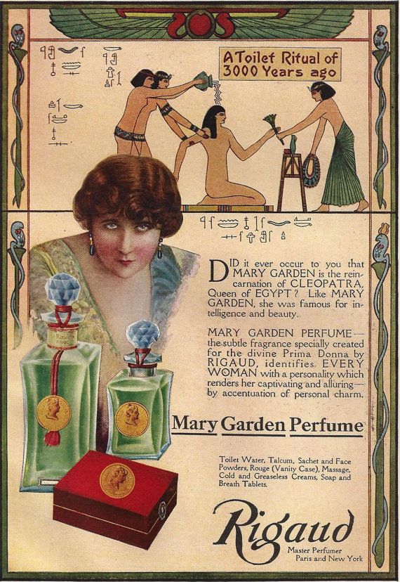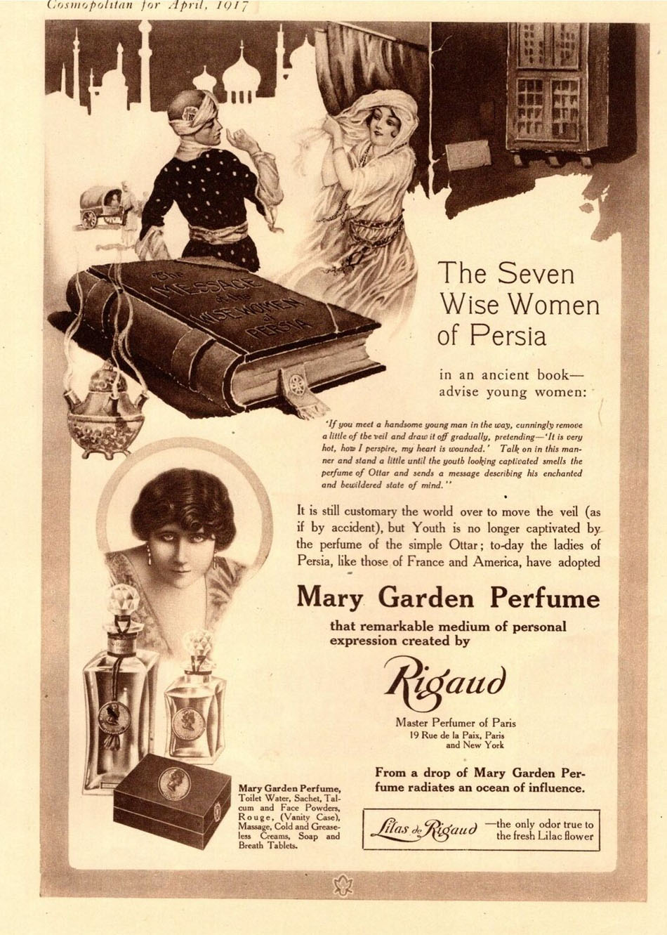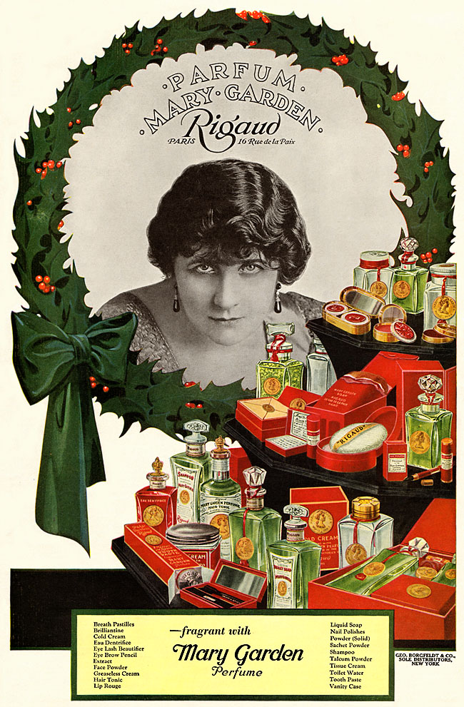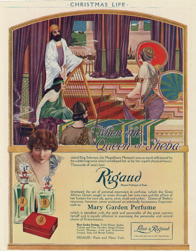 The Queen of Sheba never had a "harmonious fragance such as Mary Garden Perfume which is identified with the spirit and personality of the great soprano herself." December 1916, Life.