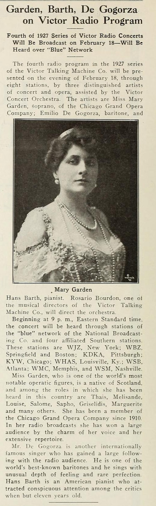 Mary Garden on Victor Radio Program, The Talking Machine World, February 1927