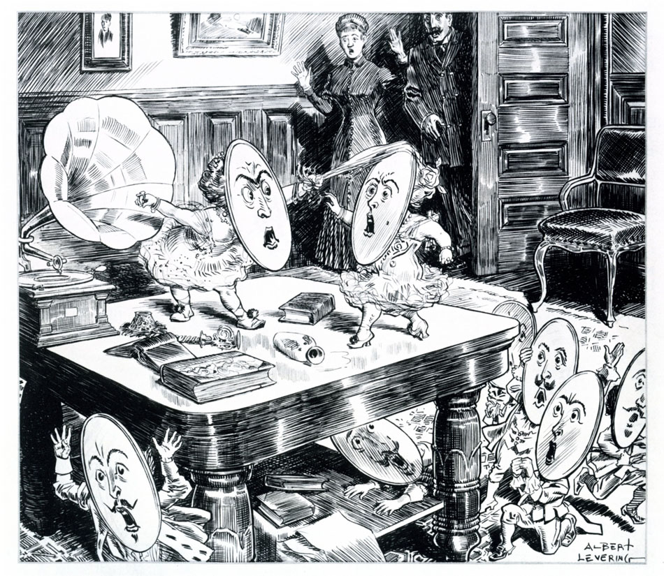 “Professional Jealousy – What happened When A Mary Garden Record Met a Tettrazini Record on the Library Table.” ca. 1910 by Albert Leving, Courtesy Music Division, Library of Congress.