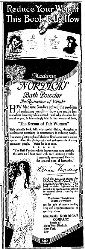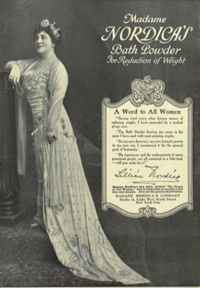 "In the advertising campaign for her weight-loss powder, Nordica even published a pamphlet with weight-loss tips, as well as pictures of other famous opera singers. The pamphlet was designed to equate the beauty and glamour of opera and opera singers with being thin—which could be achieved simply by soaking the pounds away in a bath laced with Nordica’s powder."