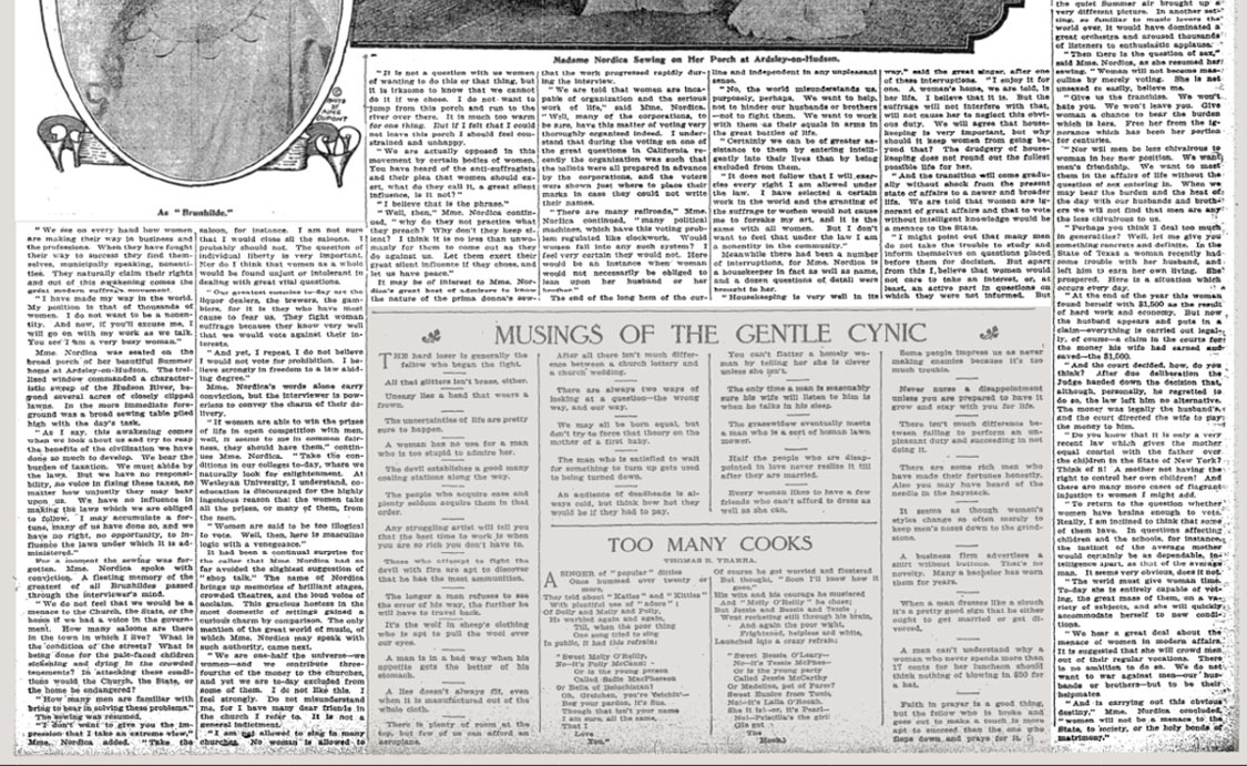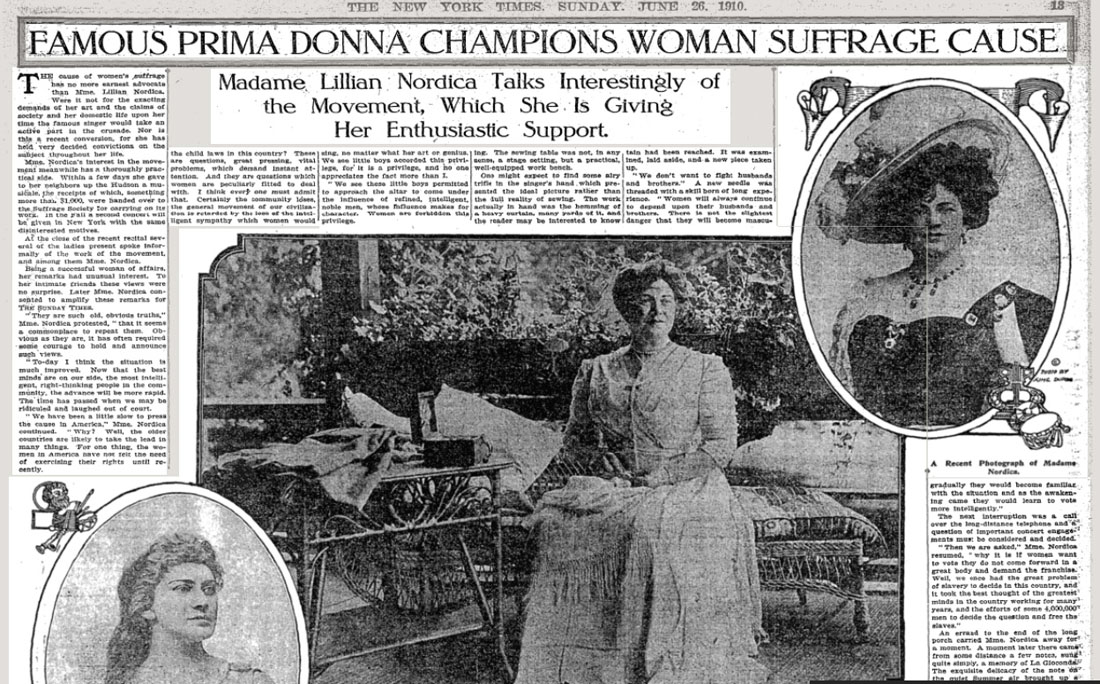 Nordica enthusiastically supports Woman Suffrage cause, New York Times, June 26, 1910