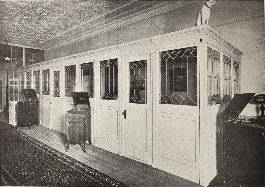 Private listening booths and demonstration rooms were designed to focus the customer's listening experience when shopping for a new machine or record. As such they were another way the phonograph was advertised and supported in its promotion of records.