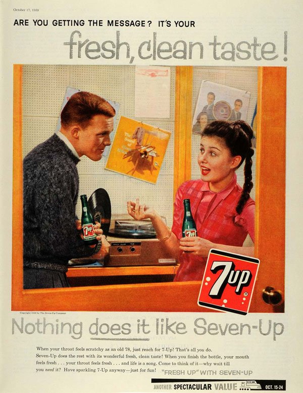 The listening booth featured in a 1959 7-Up ad shows that the booth could be more than a place to preview records before purchasing one.