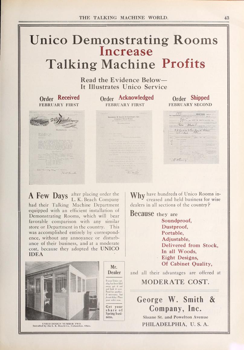 The following advertisement and others from The Talking Machine World gives some testimonials regarding increasing profits in selling machines, advantages of such rooms, and reasons to buy a Unico Design.