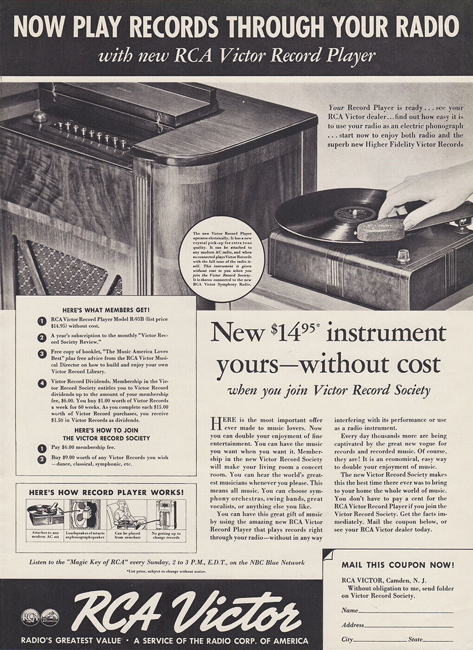 Receive a RCA Victor Record Player and Membership in the Victor Record Society, 1938