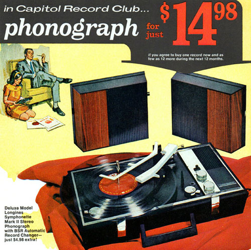 Capitol Record Club offer in 1969 of $19.96 plus shipping for "Deluxe Model Stereo Phonograph" by agreeing to buy 12 more records during the next twelve months.