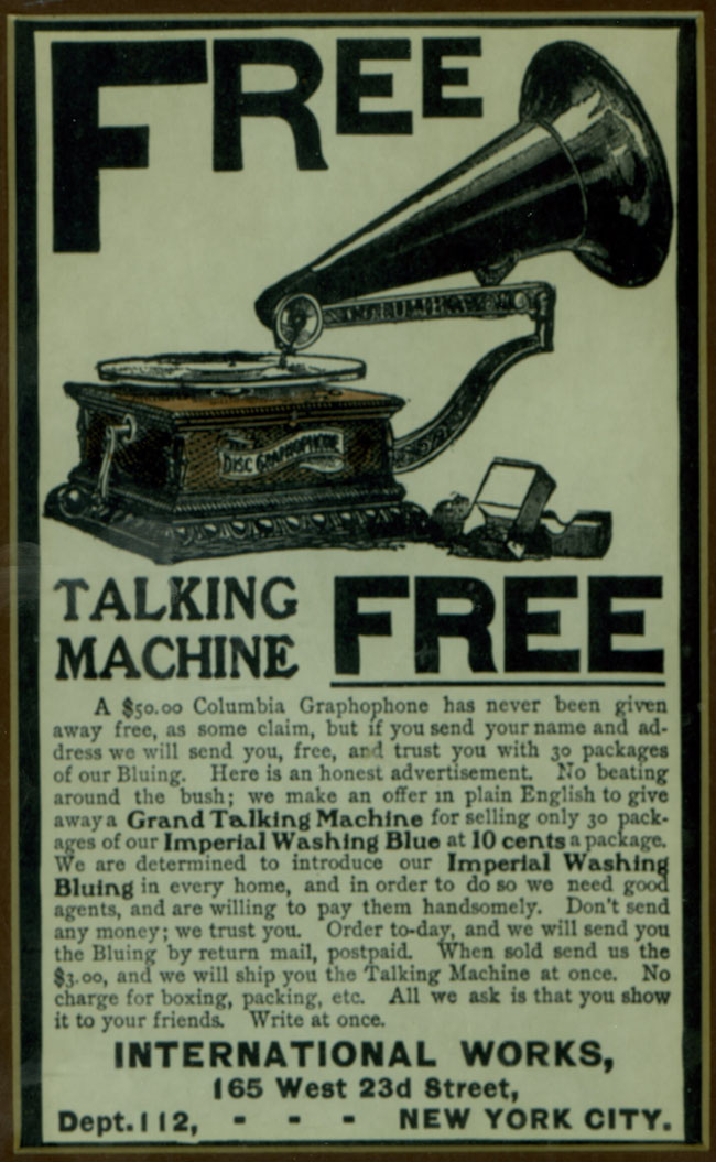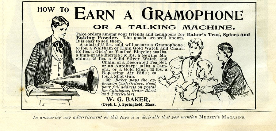 Sell 35 lbs of Baker's Teas, Spices and Baking Power and "secure a Gramophone." Munsey's Magazine, 1897 (also see September, 1897 McClure's Magazine).