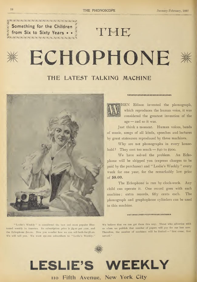 "We have solved the problem." The Echophone "will be shipped to you (express charges to be paid by the purchaser) and "Leslie's Weekly" every week for one year, for the remarkably low price of $8.00 - The Phonoscope, January 1897