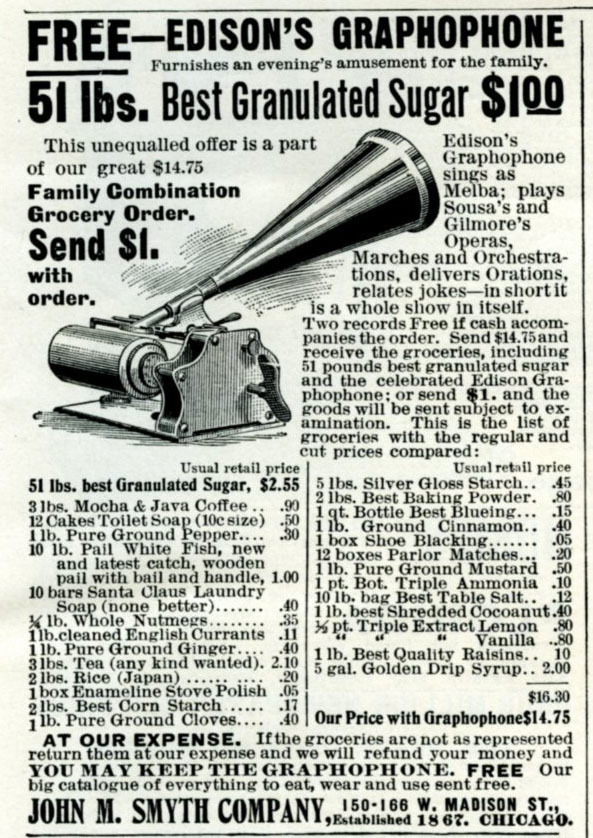 Send $14.75 for "Family Combination Grocery Order" and get free Graphophone. The Cosmopolitan Magazine 1899