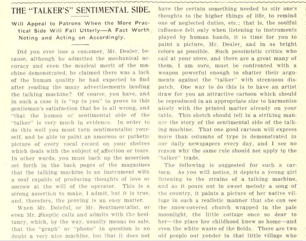The appeal made in the following article asks the dealers to emphasize that the talking machine as an instrument that has the "human quality that he expected to find after reading the many advertisements lauding the talking machine." The suggestion is to have an artist draw an attractive cartoon "to stir ones thoughts to the higher things in life...."This sketch should tell in striking manner the story of the sentimental side of the talking machine."