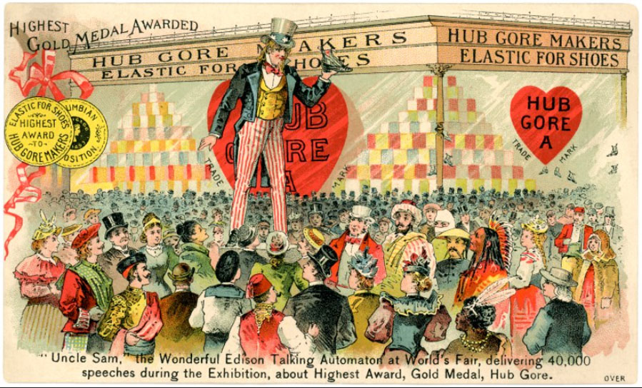 card showing Uncle Sam promoting Hub Gore shoes at the 1893 Columbian