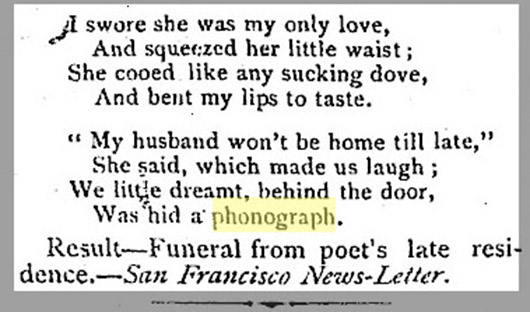 The following poem reveals the fate of man wooing another man's wife, both unaware that a phonograph had been hidden behind the door by the husband.