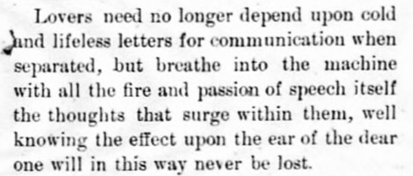 An article in 1891 by Edward D. Easton titled "The Modern Talking Machine" enthusiastically noted the impact the phonograph would have for lovers communicating their thoughts when separated.