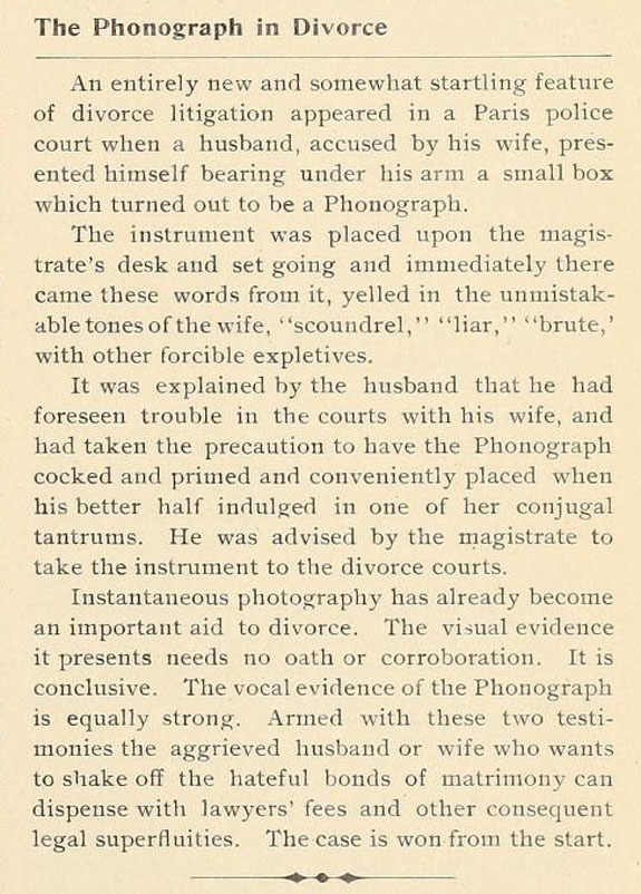 The phonograph's revolution included its participation in sometimes unexpected aspects of daily life. One of these areas was its involvement with courtship all the way up to the day of the wedding...or the day in court.