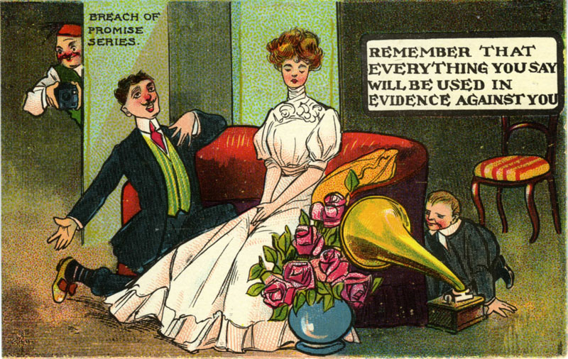 This 1908 postcard shows a marriage proposal being recorded as potential evidence for enforcing a promise. Note that the father in the background is also taking a photograph to document this event. This image also reinforces Edison's statement that "The Phonograph can captivate “sounds, with or without the knowledge or consent of the source …” Thomas Edison, “The Phonograph and its Future”, 1878.