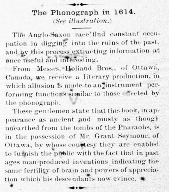 The explanation of "The Phonograph in 1614" is followed by the illustrated page from the book that is said to have the appearance "as though unearthed from the tombs of the Pharaohs."