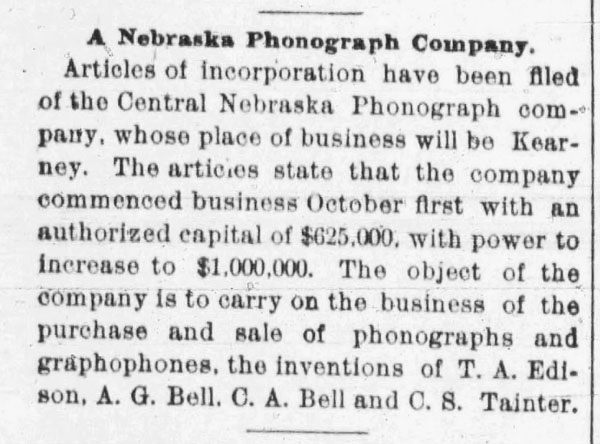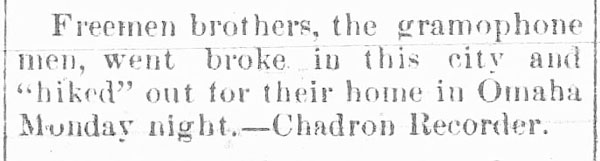 The Chadron Democrat, March 25, 1886 (Dawes County) Note: This is the earliest reference to a phonograph in a newspaper near Hay Springs, NE.
