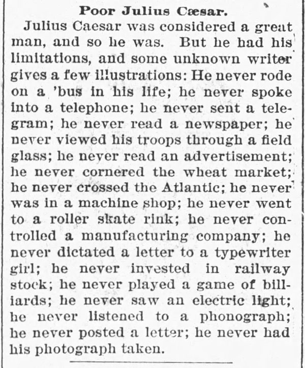Poor Julius Caesar - "he never listened to a phonograph". The Rushville Standard, February 15, 1895